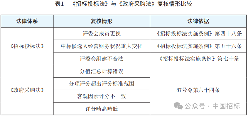 值得注意的是,两法对这一制度的表述与规制截然不同:《招标投标法》体系未直接使用复核概念,而是通过重新评审等机制实现类似功能,仅部分地方性规定(如《云南省招标投标条例》《昆明市工程建设招标投标管理办法》)对复核作出了明确运用;《政府采购法》体系则建立了较为明确的复核制度,这种差异既反映了立法技术的演进,也体现了不同法律体系对评审结果稳定性和公正性的价值权衡。