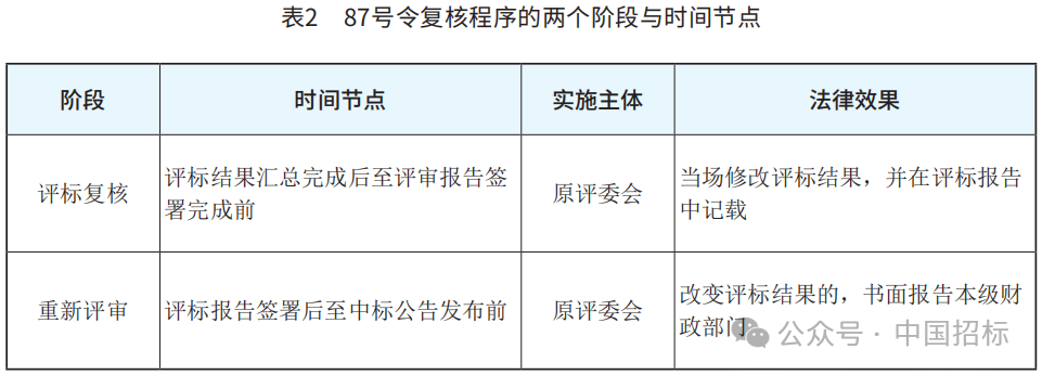 其中,《政府采购法》体系对复核时限有明确规定。87号令第六十四条明确,评标报告签署前的复核发生在评标结果汇总完成后至评审报告签署前;评标报告签署后的重新评审则发生在评标报告签署后至中标公告发布前(见表2)。