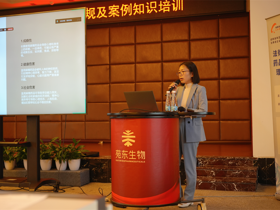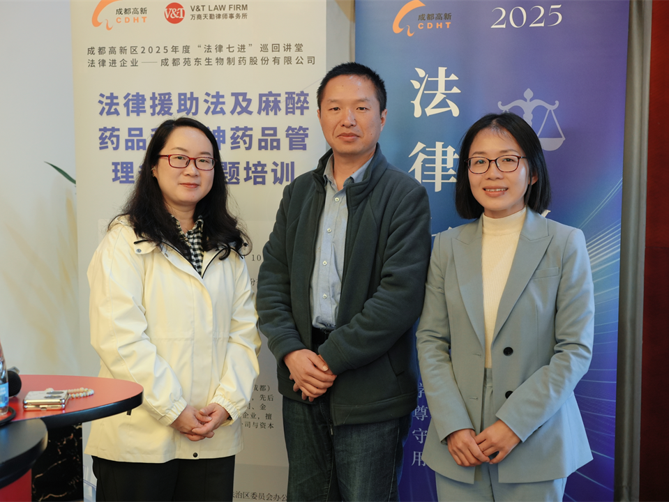 2025年10月28日,由中共成都高新区工委全面依法治区委员会办公室主办,中共成都高新区工委政法委员会、成都高新技术产业开发区应急管理局承办,成都苑东生物制药股份有限公司、高新区合作街道、万商天勤成都办公室协办的“法律七进”巡回讲堂第十二期顺利举行。本期活动走进成都苑东生物制药股份有限公司,以“法律援助法及麻醉药品和精神药品管理条例”为题,开展普法活动。