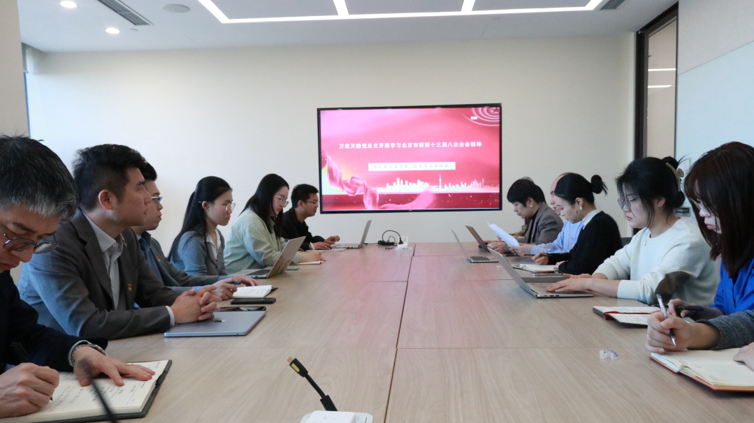2025年12月30日,万商天勤党总支在党群活动室召开专题会议,集中学习北京市委十三届八次全会精神。会议由党总支纪检委员王小飞主持,全体党员及部分业务骨干参加学习活动。