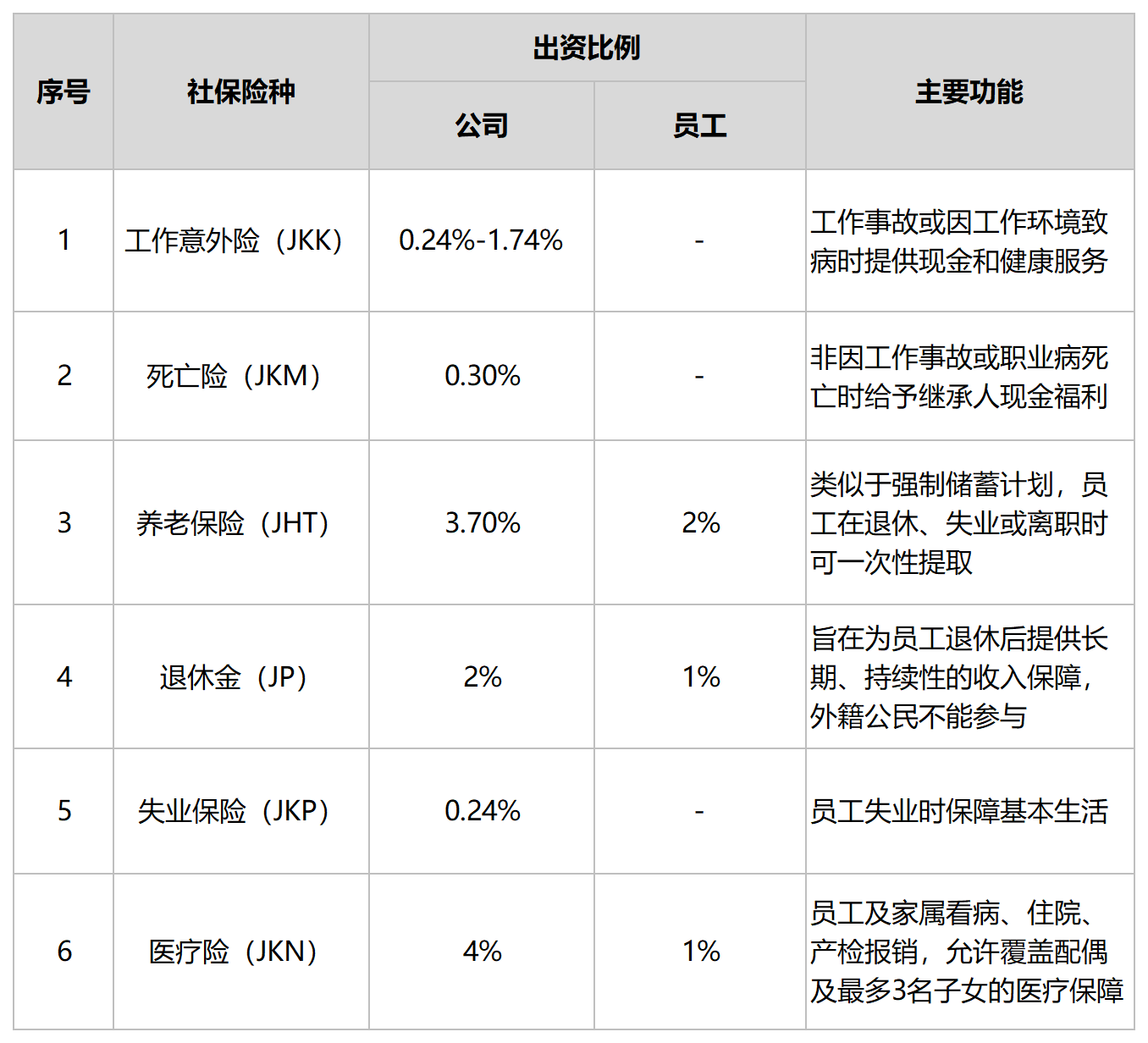 印尼的社保主要组成及缴纳比例如下: