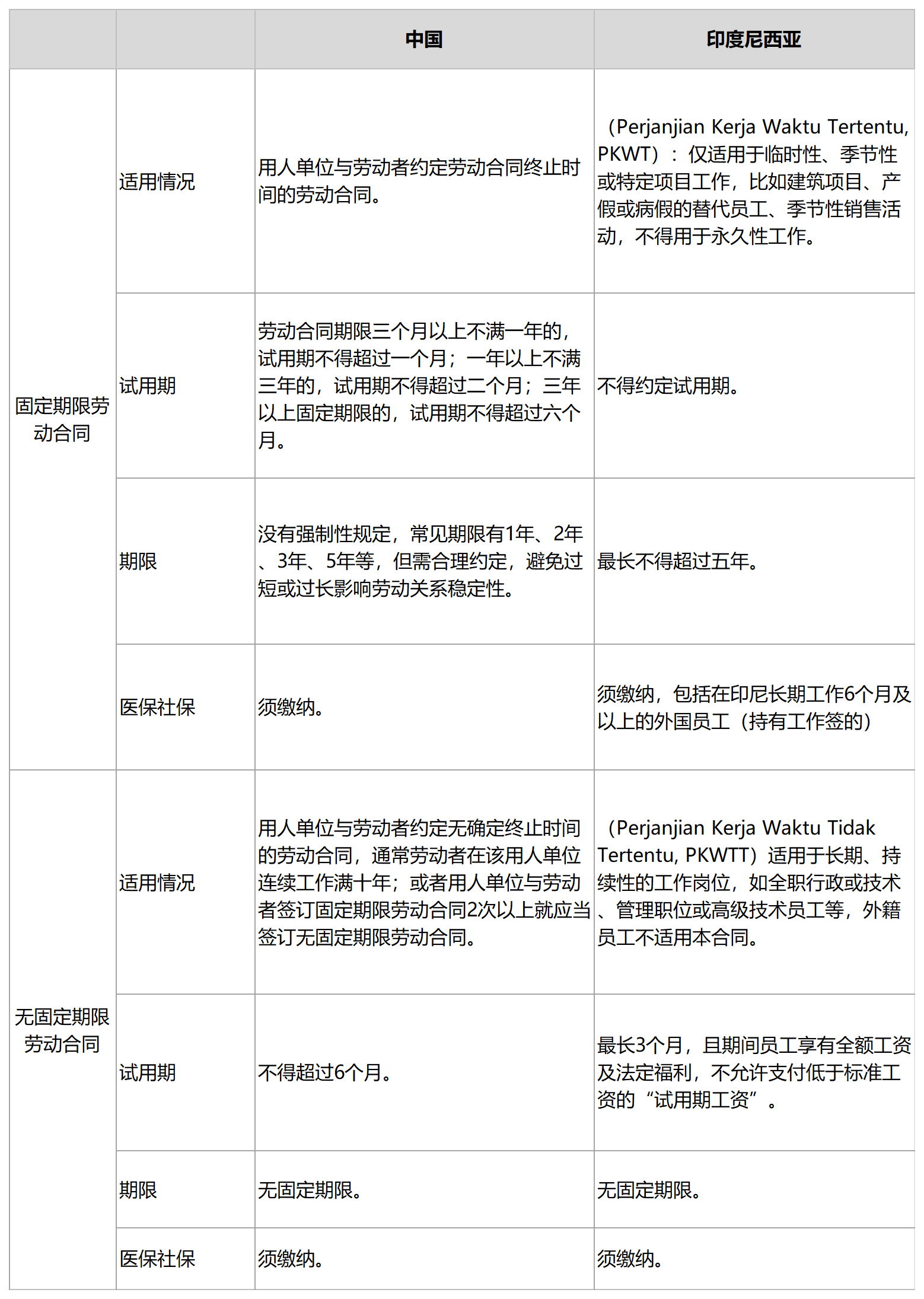 合规提示:中国和印尼两国的“固定期限劳动合同”与“无固定期限劳动合同”完全不是一个概念。在印尼,如果将所有员工签为固定期限合同,有可能被视为实质违反应当签署无固定期限劳动合同之约定,面临员工的劳动仲裁索赔以及行政处罚,故必须根据岗位性质严格区分并分别签署PKWT和PKWTT。