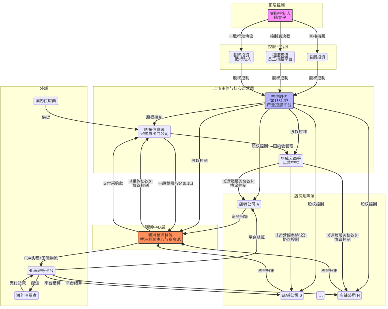(1)店铺公司:这是模式的前端触角。赛维时代设立了数百家(招股书披露为708家)子公司,每家子公司独立在亚马逊、eBay、Wish等第三方平台注册一个店铺。这些公司通常为“壳公司”,无实际经营场所与员工,其唯一职能就是持有店铺账号。这种“一地一司一店”的设计,旨在规避平台关于关联店铺的严格审查,将经营风险分散到各个独立的店铺主体。