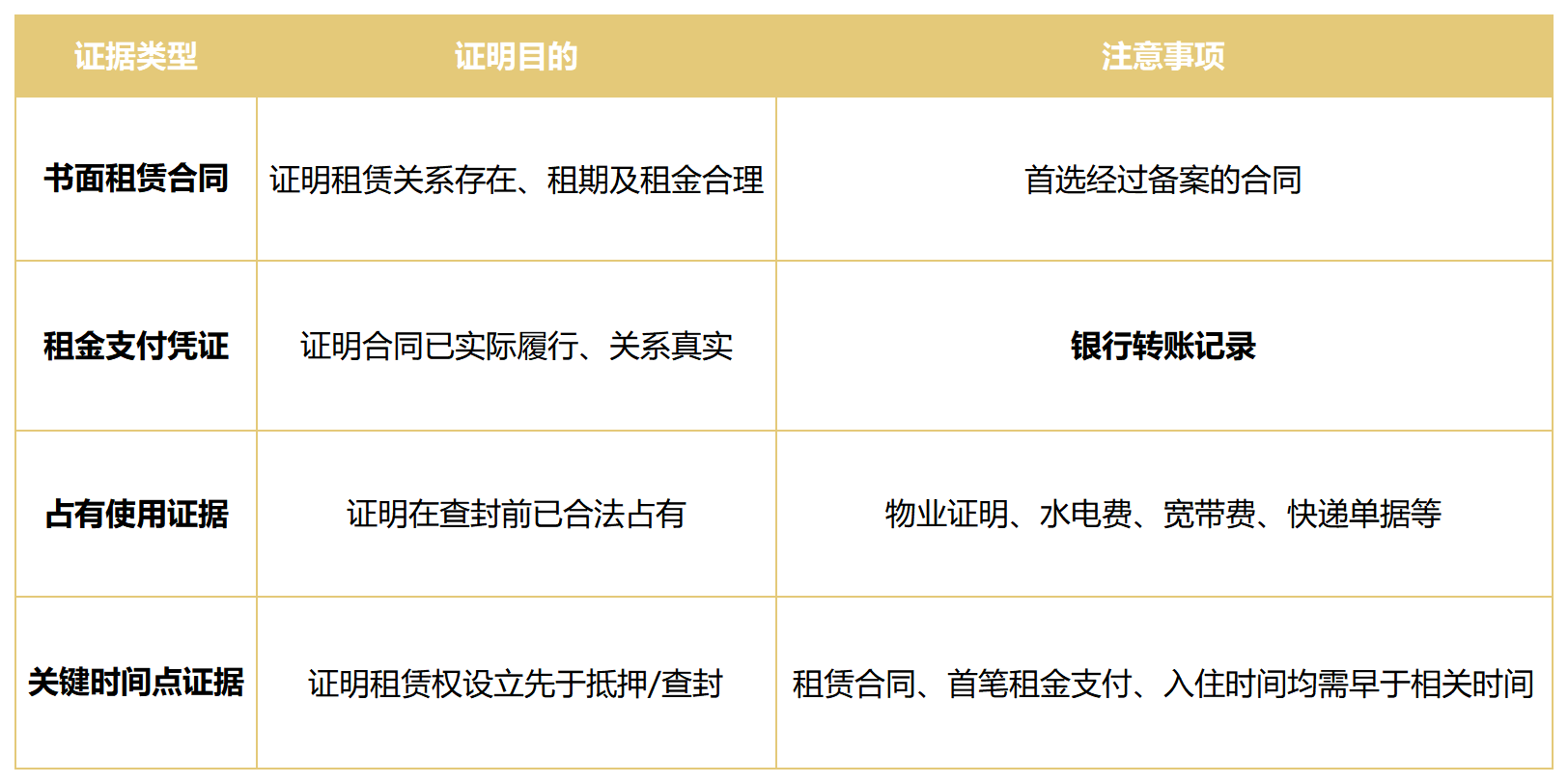 3. 承租人举证重点:合同备案证明、首期租金支付凭证、占有证据等必须早于抵押权设定或法院查封的日期。
