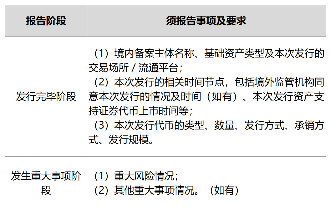 《办事指南》从备案材料要求、备案报告的具体要求、发行完成后的报告要求、报送方式等方面就境内资产境外发行资产支持证券代币的具体事宜予以了明确。