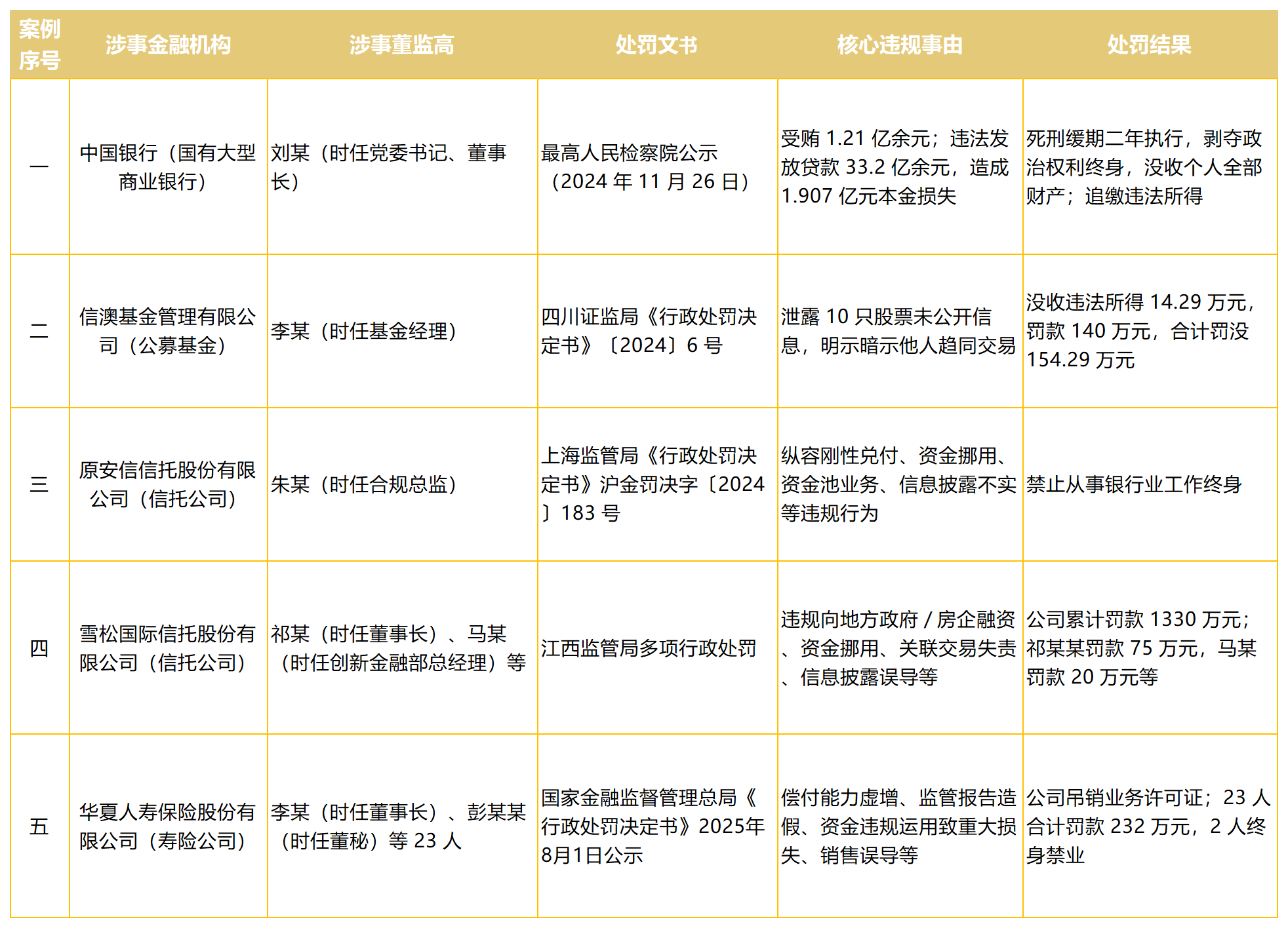 近三年来,金融监管进入 “强问责” 时代,“穿透式监管”“终身追责”“巨额罚没” 成为高频关键词。金融机构董监高作为 “掌舵人” 和 “守门人”,其履职行为直接关系金融市场稳定与投资者利益,一旦触碰合规红线,必将面临严厉追责。笔者检索并精选了五起 2023-2025 年官方公示的典型案例,覆盖银行、基金、信托、保险四大核心金融领域,均来自证监会、国家金融监督管理总局、最高人民检察院等权威渠道。通过还原违规过程、剖析追责逻辑,让读者直观感受金融机构董监高合规监管的四个趋势。