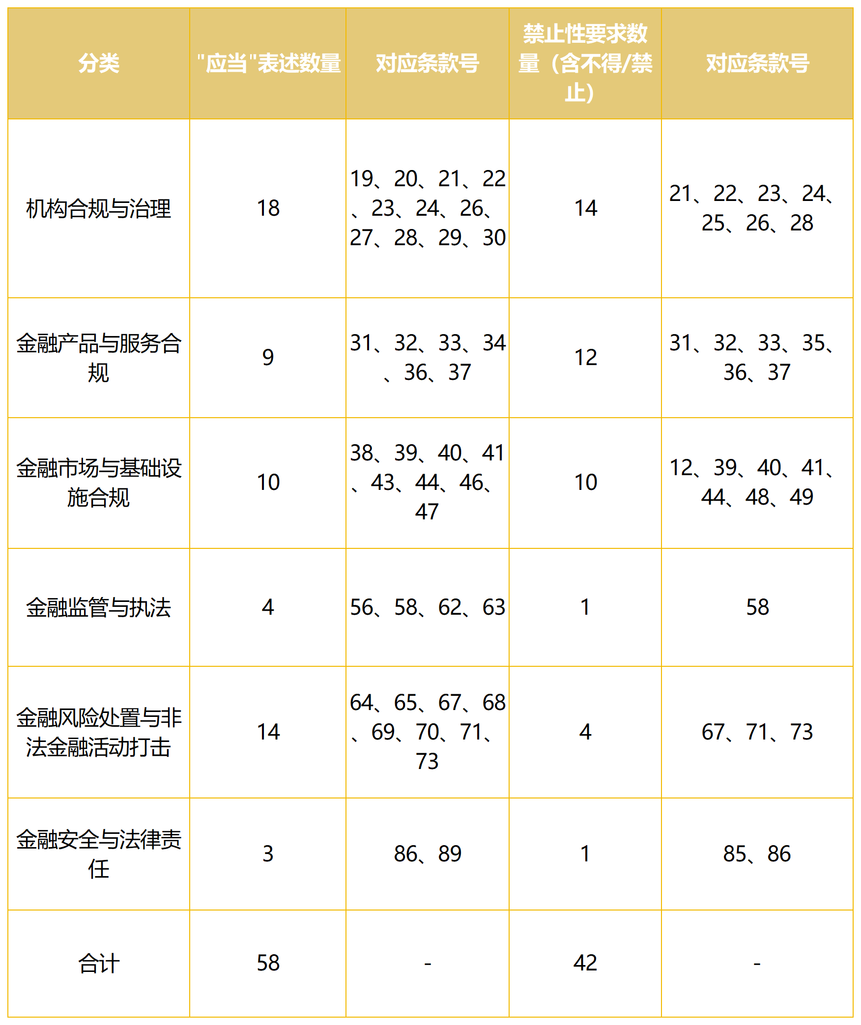 1. 这58项“应当”其实对应的就是如何“管合法”,即以基础性法律的形式为全行业合法市场主体确立统一的合规义务与行为准则,明确金融活动必须遵守的底线标准;